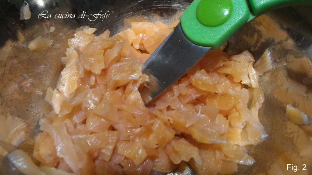 Mientras tanto, corta las lonchas de salmón en tiras ayudándote con unas tijeras de cocina y reserva (fig. 2).