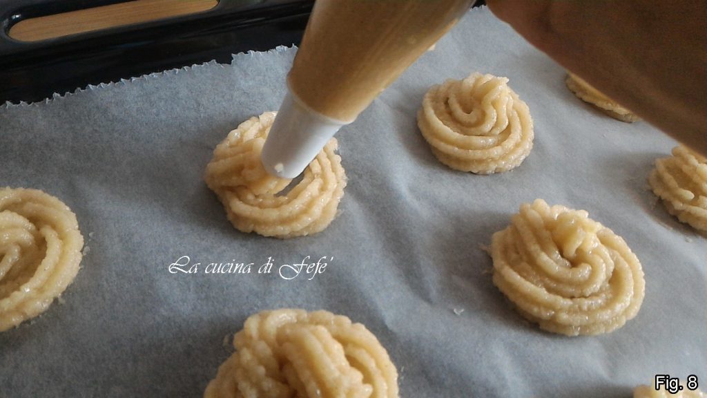• Transfiérala a una manga pastelera bien resistente, por lo tanto, no recomiendo la desechable y, con boquilla de estrella ancha, de lo contrario tendrá dificultades para sacar la pasta de almendra. Forme sus pastelitos de un diámetro de 3 cm aproximadamente *** directamente sobre una bandeja de horno forrada con una hoja de papel de horno mojada en la parte posterior con unas gotas de agua, que servirá para no moverla mientras crea los pastelitos (fig. 8).
