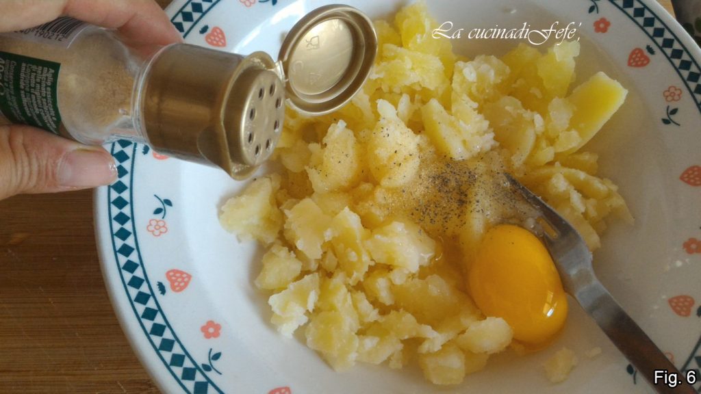 Mientras tanto, trabajad la pulpa de las patatas en un bol grande y aplastadla con los dientes de un tenedor. Añadid el huevo, la pimienta molida al gusto y el ajo en polvo (fig. 6).