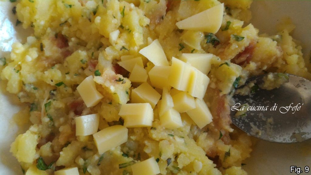 Completad añadiendo la provola cortada en daditos y el jamón en trocitos, luego mezclad hasta amalgamar bien todos los ingredientes (fig. 9).