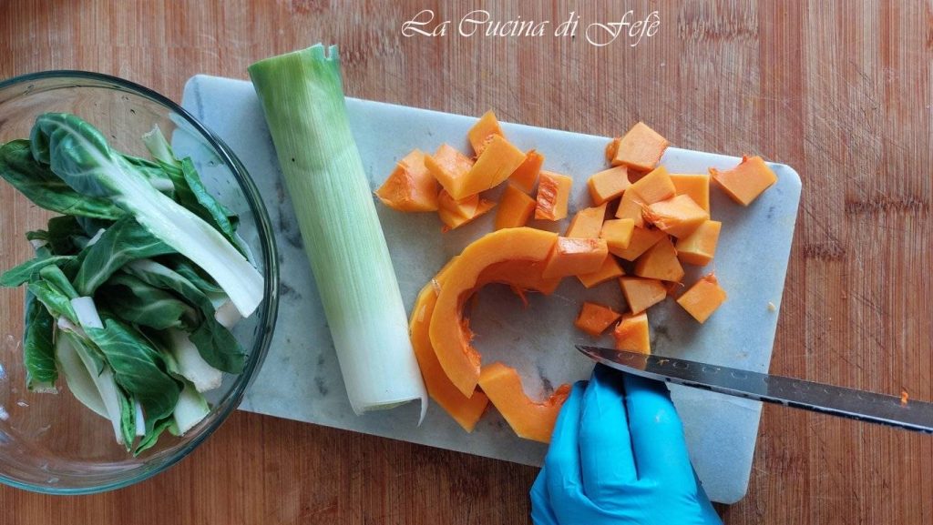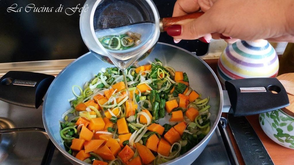 Luego añade también el dado de calabaza y deja sazonar todavía un par de minutos a fuego alto.