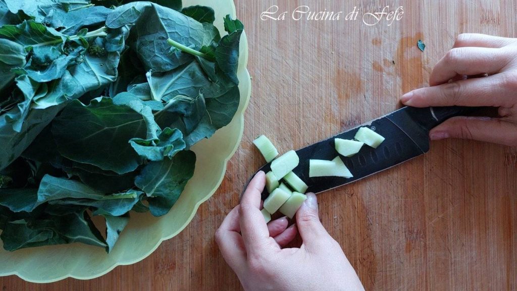 Separa el tallo central de las inflorescencias con un pelador o un cuchillito, quita la parte exterior más dura y fibrosa. Debes llegar al corazón, que es de un verde claro, casi blanco. Luego córtalo en cubitos pequeños. Lávalo bien bajo el grifo junto con las hojas.