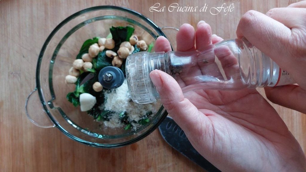 Pasa al vaso de la batidora los tallos y las hojas bien escurridos, las avellanas tostadas, el diente de ajo (sin el germen para hacerlo más digestivo), el queso parmesano rallado, una pizca de sal (poca) y pimienta.