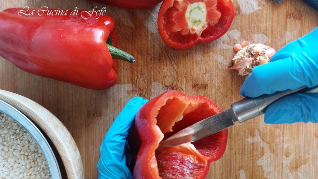 🔵En esta receta he utilizado el arroz originario, una variedad de arroz redondo, pequeño y perlado, conocido por su alta cantidad de almidón, resultando particularmente suave al paladar, pero también el Carnaroli irá de maravilla. Además, puedes preparar los pimientos rellenos también con risotto sobrante del día anterior, eventualmente como receta de reaprovechamiento. ¡Será incluso mejor!