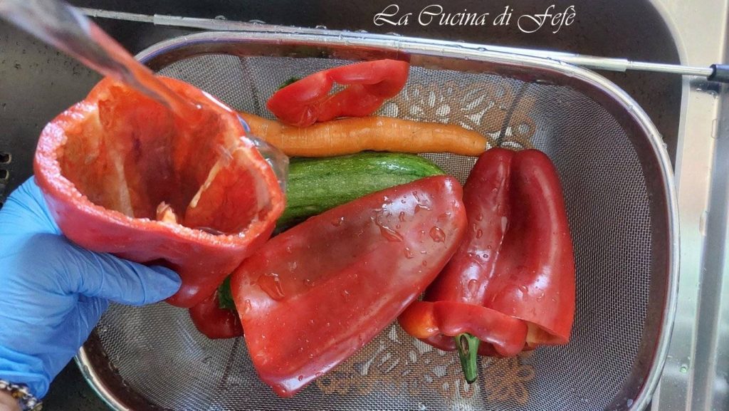 Después de haber repetido esta operación con los demás pimientos, enjuágalos abundantemente bajo el agua corriente junto con las otras verduras previstas en la receta.