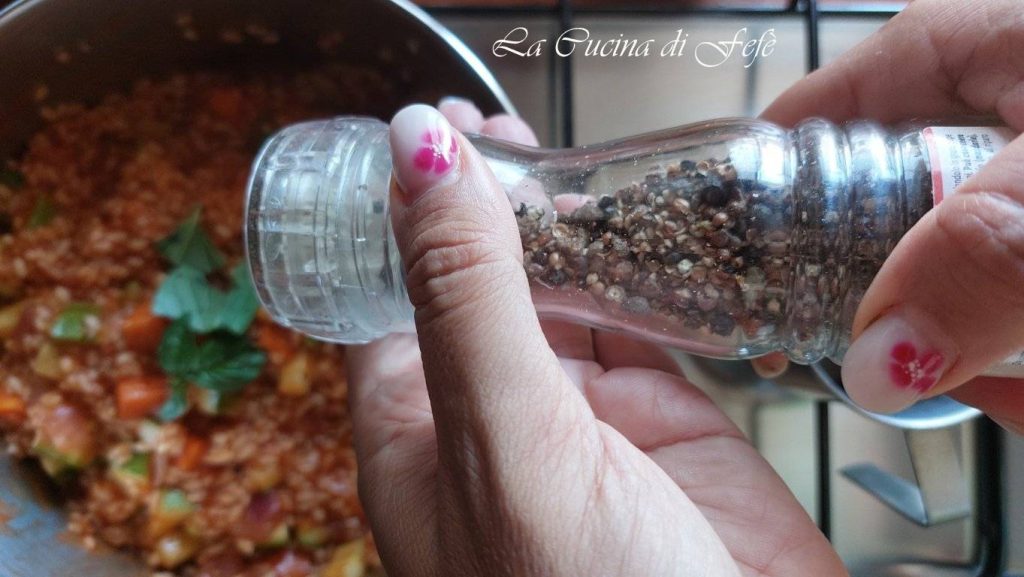 Después de unos 3′ añade los cubos de calabacín y la salsa de tomate cherry, mezcla nuevamente y agrega un cucharón de caldo apenas el anterior haya sido completamente absorbido.