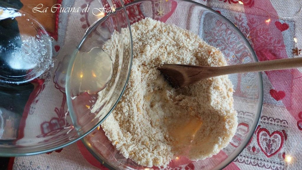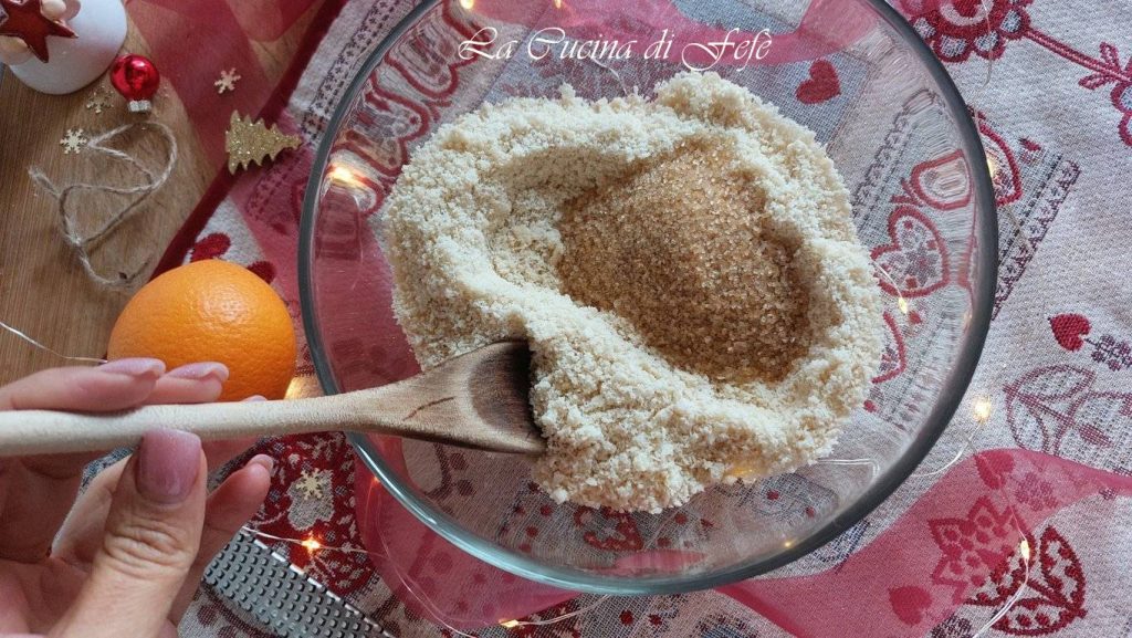 • Preparar los pizzicotti de almendra es realmente facilísimo. En un cuenco, comienza mezclando con la ayuda de una cuchara de madera el azúcar de caña con la harina de almendras*.