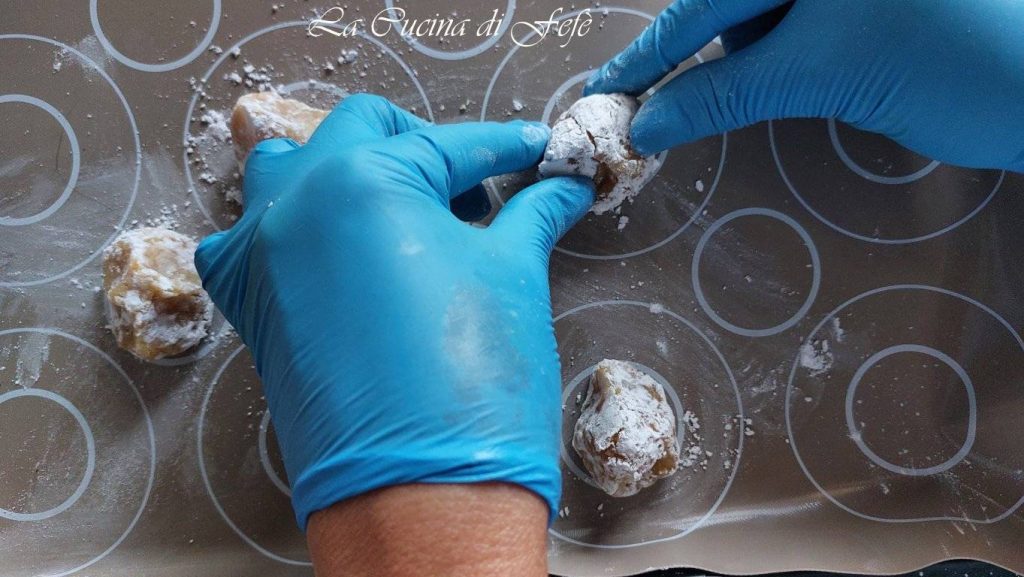 • Coloca las bolitas en una bandeja forrada con papel de horno o como hice yo, con un tapete de silicona reciclable y pellízcalas con el pulgar y el índice de ambas manos, presionando ligeramente. Lleva la bandeja al frigorífico y deja reposar las galletas al menos 3 h pero sería mejor toda la noche***. Una vez transcurrido el tiempo de reposo, cocina en horno ventilado precalentado a 170°C durante 12′ no más. Deben dorarse ligeramente o se endurecerán demasiado.