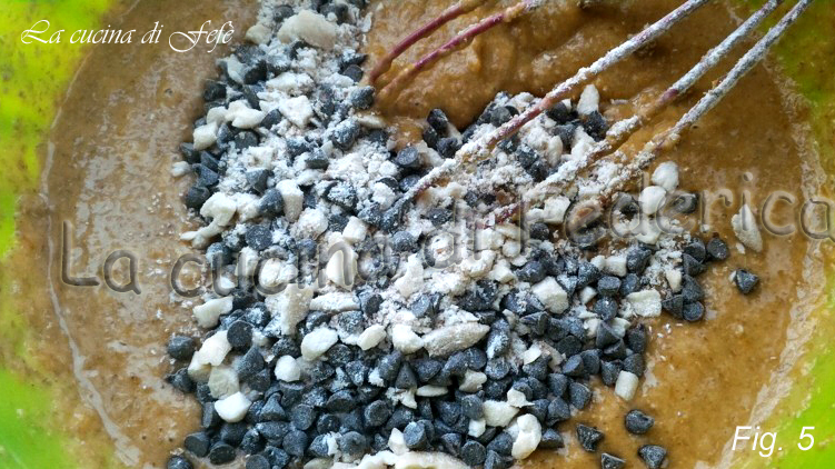 • Finalmente, añade las gotas de chocolate y las almendras ligeramente enharinadas sin mezclar mucho para que no se hundan completamente durante la cocción (fig. 5).
