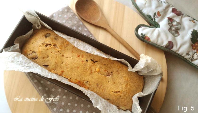 • Verter la mezcla en un molde de plum-cake forrado con papel de horno previamente mojado y escurrido y cocinar en el horno a 180°C durante unos 45′. Hacer siempre la prueba del palillo para verificar que la cocción sea la óptima. Apagar el horno, dejar 5′ con la puerta ligeramente abierta, luego desmoldar y dejar enfriar por completo antes de desmoldar (fig. 5).