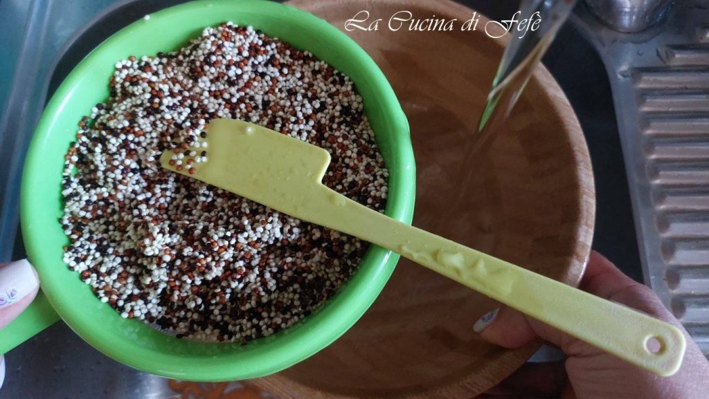 Enjuaga abundantemente la quinoa bajo agua corriente ayudándote con un bol y un tamiz de malla fina. Este paso es muy importante porque elimina la saponina presente naturalmente en la superficie de los granos, que además de ser amarga, también es ligeramente tóxica. Repite el enjuague al menos tres veces, hasta que el agua se vuelva clara y no más espumosa. Finalmente, déjala escurrir unos minutos antes de usarla.