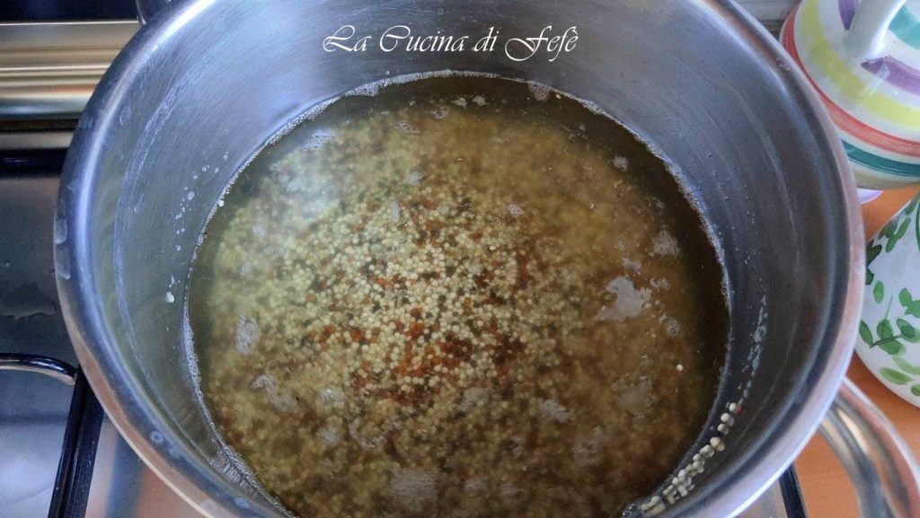 Agrega el caldo de verduras caliente hasta cubrirla por completo (una parte de quinoa y tres de agua) y lleva a ebullición.