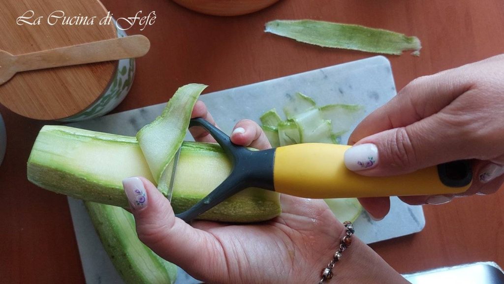 Lo primero que hay que hacer es poner a marinar los calabacines para que tengan todo el tiempo de absorber los sabores, así que lávelos abundantemente bajo agua corriente, despúntelos y córtelos en cintas muy finas con la ayuda de una mandolina.