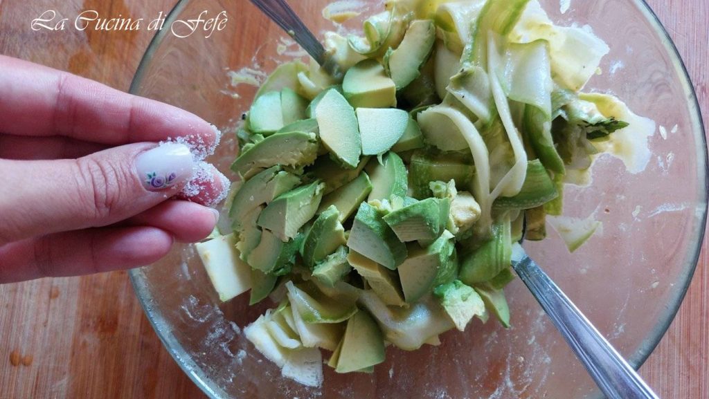 Mientras tanto, lava un aguacate, divídelo por la mitad y elimina el hueso interno y la cáscara externa. Divide nuevamente cada mitad y redúcelo a rodajas finas.