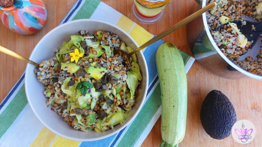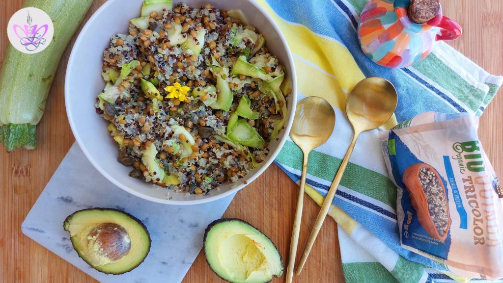 Si aún no la conoces, la quinoa es por excelencia la alternativa a los cereales comunes. A menudo se considera erróneamente un cereal, probablemente porque en la cocina se utiliza para sustituir la pasta o el arroz o para acompañar platos a base de verduras, legumbres, etc., pero en realidad es una planta herbácea que se asemeja más a vegetales como espinacas y remolachas. Este alimento encierra una alta concentración de nutrientes diversos e importantes para el organismo, ¡convirtiéndola en un verdadero superalimento! No es de extrañar, por tanto, que sea ampliamente utilizada por vegetarianos y veganos por sus grandes propiedades, y además, siendo totalmente libre de gluten, resulta indicada para quienes sufren de celiaquía. Dicho esto, la receta que comparto hoy es un excelente plato único, la solución perfecta cuando se desea consumir una comida ligera o mantenerse ligero. La quinoa se tuesta primero y luego se cocina casi al vapor, y después se adereza con calabacines crudos simplemente marinados. La adición de lentejas aporta la proteína que todos necesitamos, y los trozos de aguacate esa riqueza de grasas monoinsaturadas saludables que mejoran los niveles de colesterol y reducen los riesgos de enfermedades cardiovasculares. Ningún ingrediente de origen animal en esta preparación que por tanto podrá ser adecuada para cualquier necesidad alimentaria.