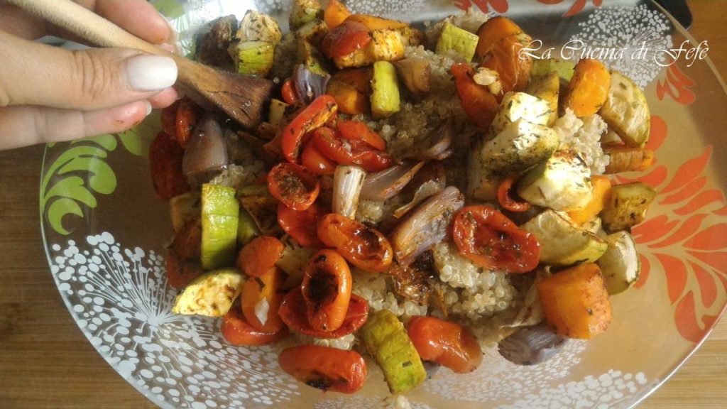 Una vez cocidas también las demás verduras, hornéalas y únelas a la quinoa, condimentando con un buen toque de aceite de oliva virgen extra, y finalmente mezcla.