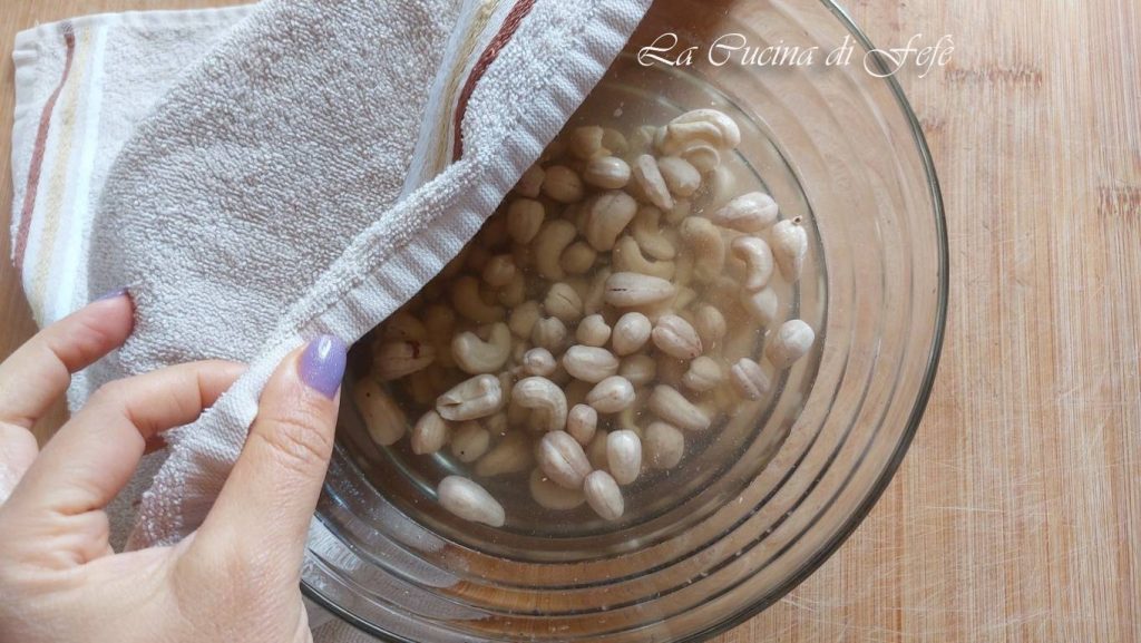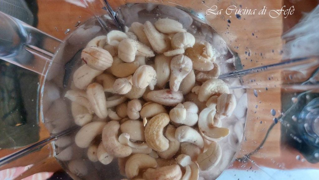 Transfiere los anacardos así remojados al vaso de una batidora junto con la mitad del agua indicada en la receta, es decir, 400 ml, y tritura en varias ocasiones por unos minutos.