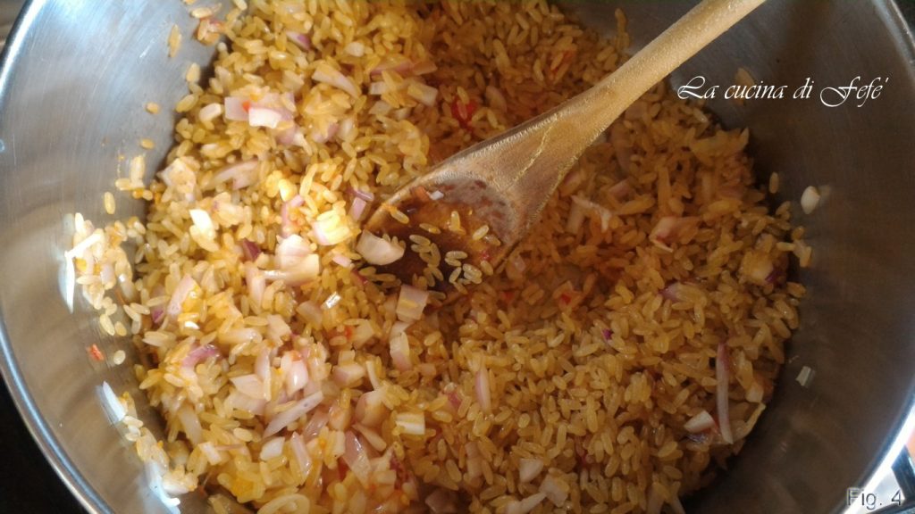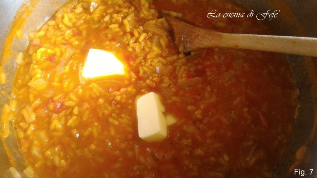 Lleva el risotto a cocción, removiendo frecuentemente y añadiendo cucharones de caldo alternados con la salsa de tomate, dejándolos absorber antes de añadir los siguientes. Luego apaga el fuego, añade la mantequilla y mezcla.