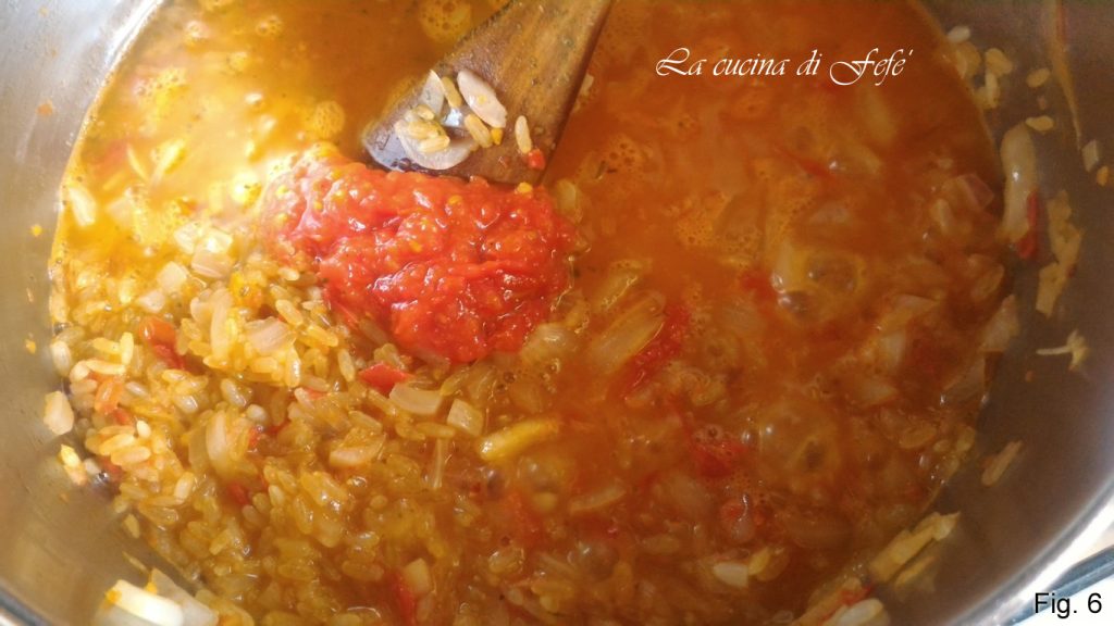 En este punto, baja el fuego y añade un cucharón de caldo vegetal caliente y un par de cucharadas de salsa de tomate horneada.