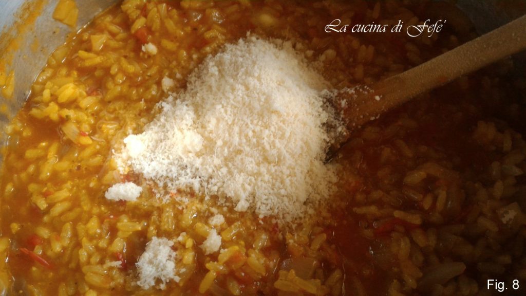 Añade también el parmigiano rallado, mezcla de nuevo y deja reposar el risotto un par de minutos.