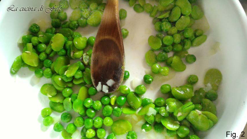 En la misma agua de los espárragos, hierve durante 4 minutos las habas y los guisantes, luego escúrrelos bien. En una sartén, dora 1/2 cebolla finamente picada con un chorro de aceite y 2 cucharadas de caldo de espárragos. Después de aproximadamente 1 minuto, agrega las habas y los guisantes y deja sazonar durante otros 2 minutos a fuego lento (fig. 2).