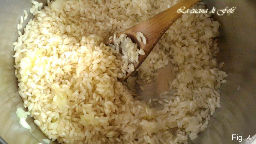 Apaga el fuego, ajusta la sal y añade pimienta. Mientras tanto, en una cacerola grande, tuesta el arroz con la otra mitad de la cebolla finamente picada (fig. 4).