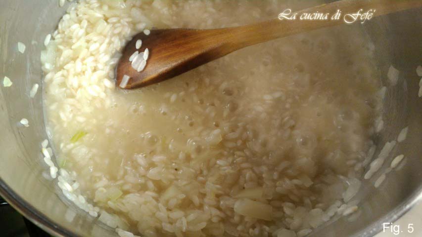 Desglasa con el vino blanco, subiendo un poco la llama, luego, después de haberlo dejado evaporar, lleva a cocción bajando al mínimo y añadiendo un cucharón de caldo caliente a la vez (fig. 5).