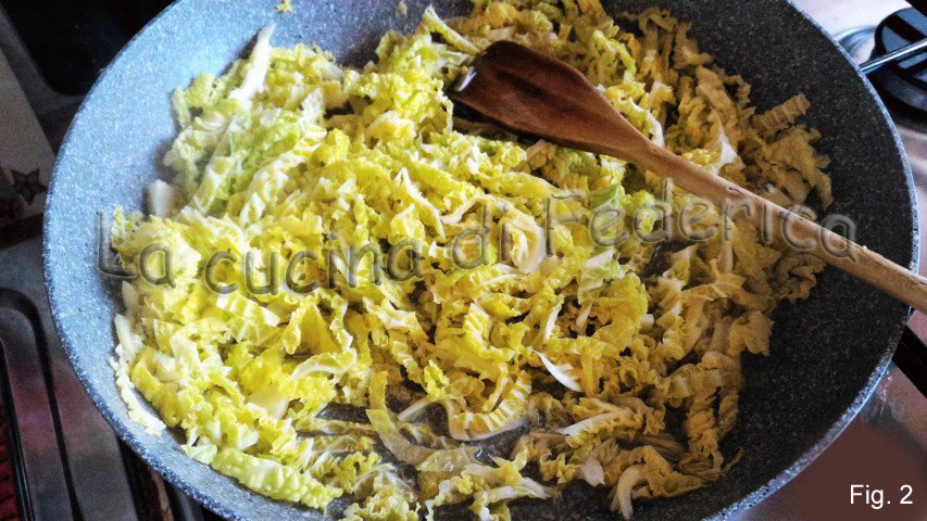 Estofarlas en una cacerola grande con un hilo de aceite durante unos 12′ a fuego lento, añadiendo unos 70 ml de caldo caliente de la cocción de las patatas y la col y una pizca de sal.