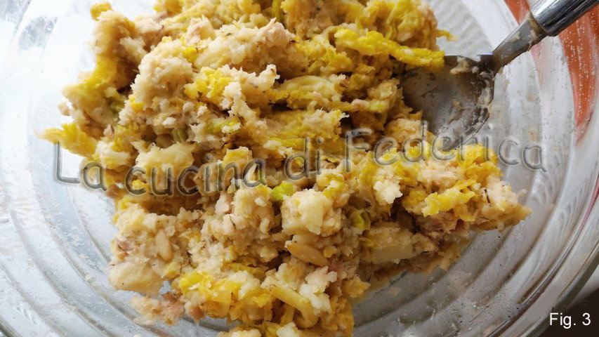 Apagar, escurrir el exceso de caldo no evaporado y verter la verdura en un bol grande. Añadir también las patatas cocidas y trituradas con un prensador de patatas, el provolone dulce en cubitos y los filetes de atún bien escurridos. Completar añadiendo el huevo, la mitad del parmesano rallado, la nuez moscada y ajustar de sal y pimienta. Mezclar bien la mezcla.