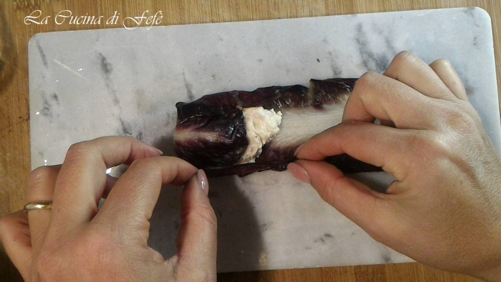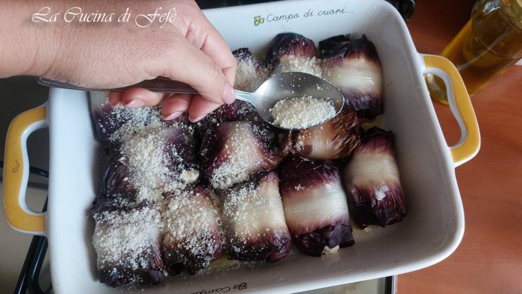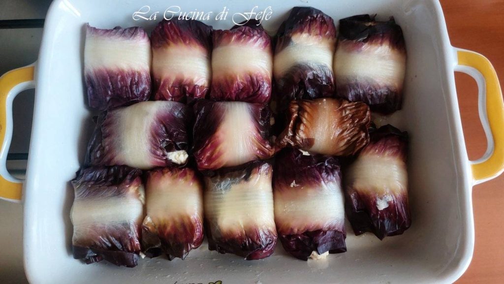 Hornea los rollitos de radicchio a 180°C durante unos 25′-30′ o hasta que estén bien dorados.