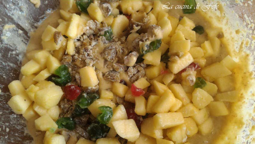 • Pela y limpia las manzanas del corazón y las semillas centrales, luego divídelas en rodajas y a su vez en cubitos. Une las manzanas a la fruta confitada también cortada en cubitos, reservando algunas enteras para decorar, rocíalas con el zumo de limón, mezcla con una cucharada de azúcar moreno y deja reposar 30′ (fig. 1).