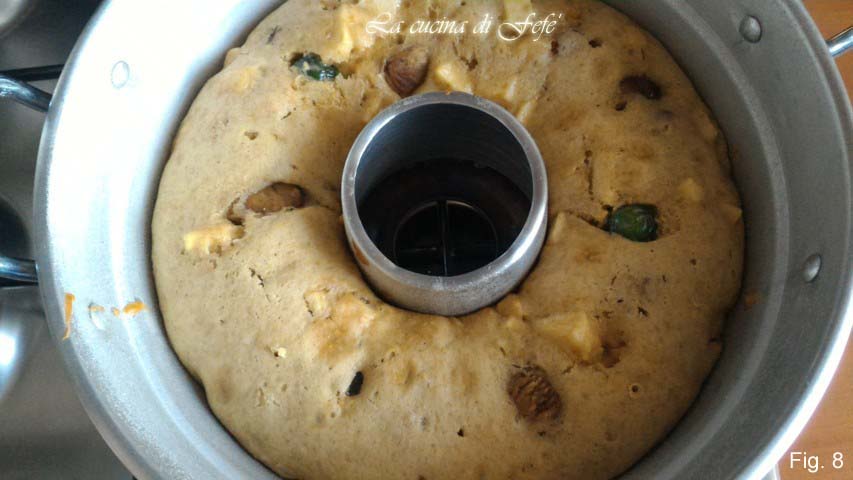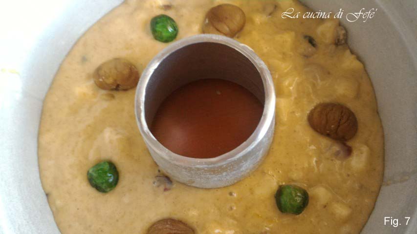 • Unta con mantequilla y enharina bien la olla del horno y vierte la mezcla dentro, nivelándola. Decora la superficie con las castañas y la fruta confitada que habías reservado, sin hundirla (fig. 7).