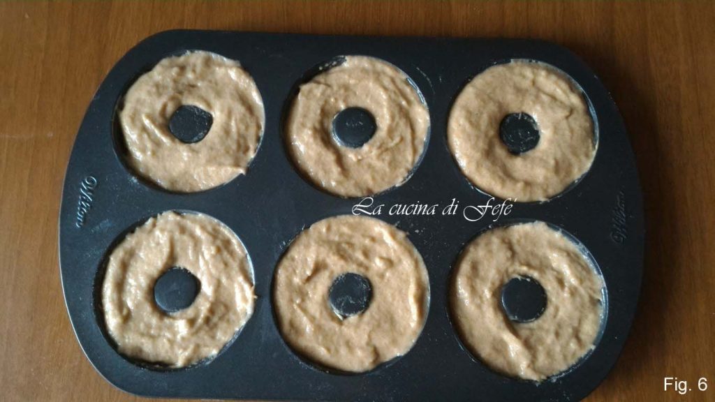 Vierte la mezcla en el molde para rosquillas, sin llenarlo hasta el borde para evitar que se desborde al hornearlo.