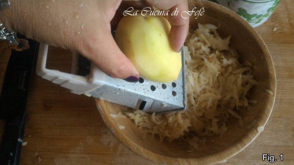 • Comienza lavando las patatas bajo agua fría corriente, luego colócalas sobre una tabla de cortar y pélalas con un cuchillo o un pelador. Rállalas con un rallador de agujeros grandes dentro de un tazón grande (fig. 1).