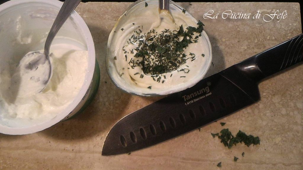 • Aparte, pique finamente con el cuchillo las hierbas aromáticas y agréguelas a la crema de yogur.
