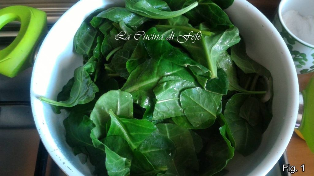 • Para preparar los sofficini, comienza con el relleno. Después de lavar las espinacas baby bajo agua corriente, déjalas marchitar durante 5′ en una sartén con un diente de ajo, dos vueltas de aceite y su propia agua de vegetación (fig. 1).