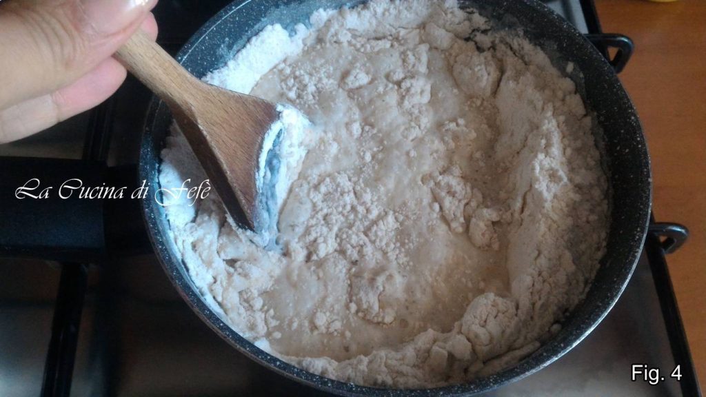 • Una vez derretidos, añade la harina en forma de lluvia y la sal y con una cuchara de madera empieza a mezclar enérgicamente para que los ingredientes líquidos sean absorbidos (fig. 4).