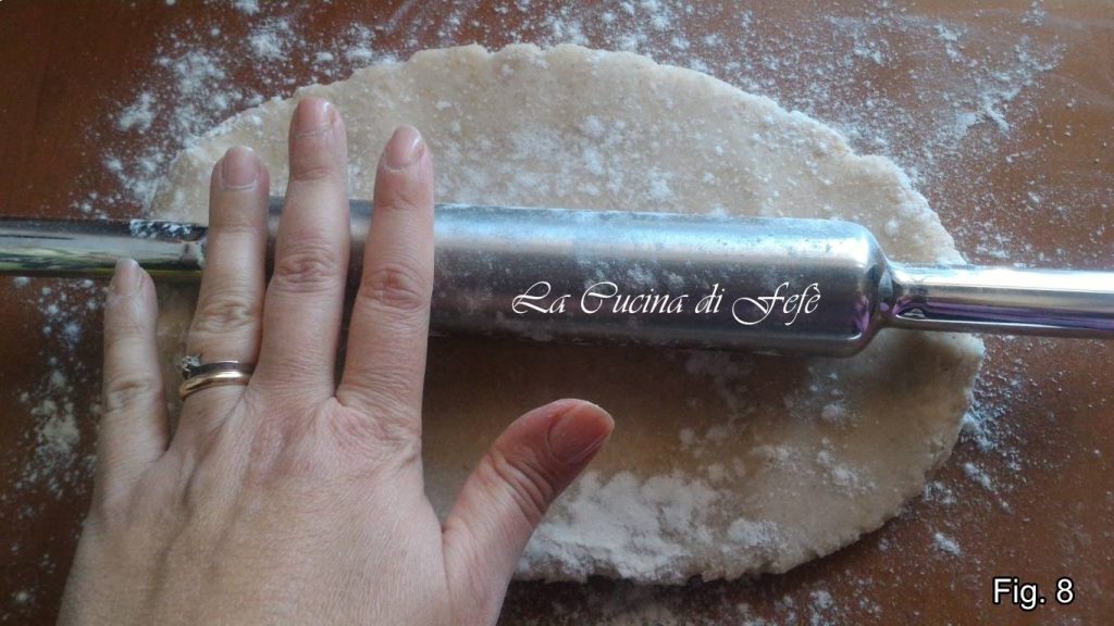 • Pasado este tiempo, siempre sobre la superficie enharinada, estira una lámina delgada con la ayuda de un rodillo (fig. 8).