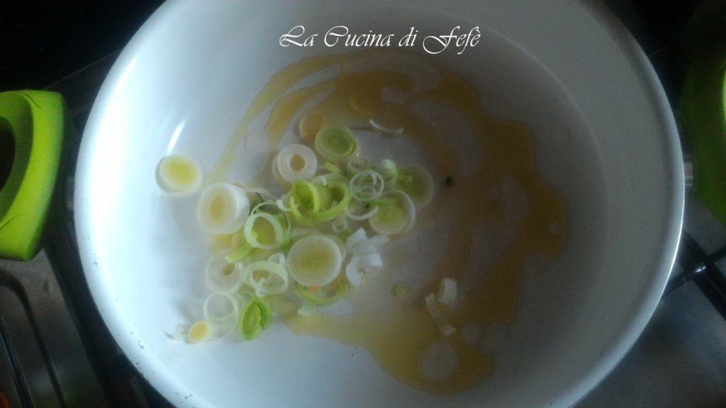• En un wok grande mientras tanto, dorad el resto del puerro con un generoso chorro de aceite.
