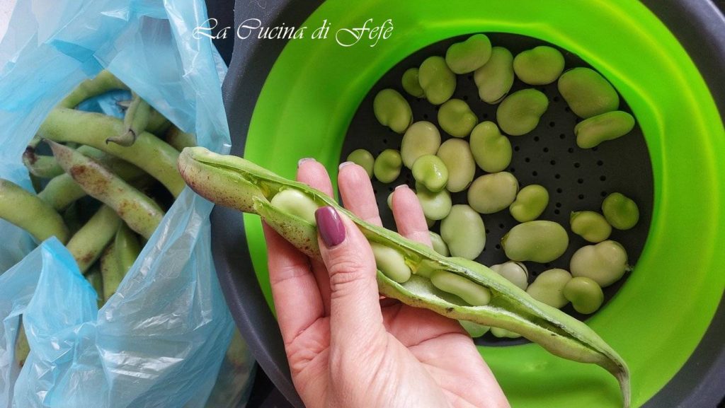 Una vez desgranadas, ahora es necesario quitarles también la piel que las recubre. Elimina también el tegumento, es decir, la excrecencia que se encuentra en uno de los extremos, quítales la piel y procede de este modo con todas las habas que tengas. Lávalas luego muy bien bajo el agua corriente.