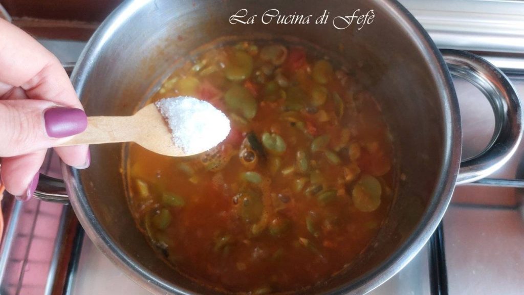 Cuando las habas empiecen a estar tiernas, añade un poco más de agua caliente, no pongas mucha, la pasta con habas debe quedar cremosa, si es necesario, agrégala poco a poco y solo si es necesario, luego vuelve a llevar a ebullición y ajusta de sal.