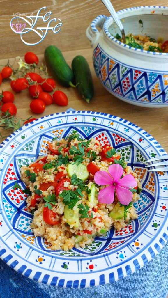 Desde hace varios años he desarrollado una verdadera pasión por la cocina internacional, ¡y en particular la étnica! Me encanta ponerme siempre a prueba y probar recetas tanto de nuestra tradición culinaria como de otras culturas. Hoy, por ejemplo, quise llevar a la mesa un plato árabe, perteneciente a la cocina levantina, una ensalada a base de bulgur, mucho perejil y menta picados finamente, con la adición de ingredientes crudos como tomates y pepinos cortados en trocitos y simplemente aderezados con aceite y jugo de limón. Para quienes no lo conozcan aún, el bulgur no es más que trigo «partido», es decir, granos de trigo con una forma irregular, más grandes que los del cuscús, que se hacen germinar y cocinar al vapor, para luego ser secados y reducidos a pedacitos. En el mundo árabe y especialmente en Siria es muy popular y normalmente se sirve entre las Mezè, al inicio de la comida propiamente dicha y adornado con lechuga. La variante libanesa utiliza más perejil que bulgur, mientras que en las variantes siria y palestina este segundo elemento está presente en cantidad predominante. Yo he preferido abundar con el bulgur, enriqueciendo el plato con tiras de pimientos asados, pero que vosotros podéis añadir crudos si lo preferís. En fin, un plato fresco y veraniego con un gran poder saciante, además de vegano, es decir, sin ingredientes de origen animal. En verano, será vuestro comodín en la cocina, perfecto para llevar a la playa o cada vez que desees disfrutar de una comida ligera, sencilla y de modesto aporte calórico.