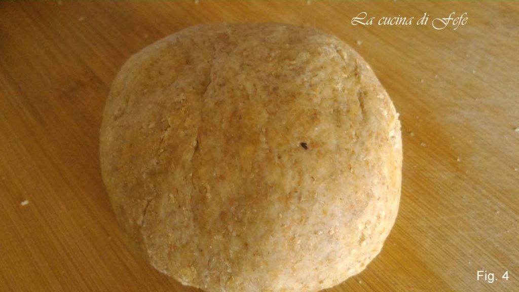 Transfiere la masa a una tabla de amasar y continúa amasando. Si es necesario, añade una cucharada de aceite. Forma una bola que deberá reposar 30′ envuelta en film transparente (fig. 4).