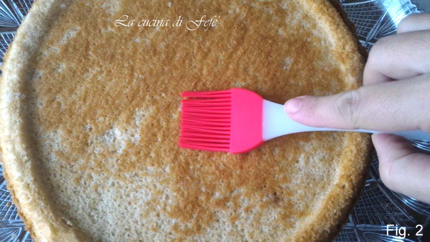 Una vez enfriada, prepara un jarabe alcohólico*: mezcla en un bol el maraschino con el agua y el azúcar. Remueve y con un pincel de cocina moja la parte interna de la tarta, el borde superior y la parte exterior del borde.
