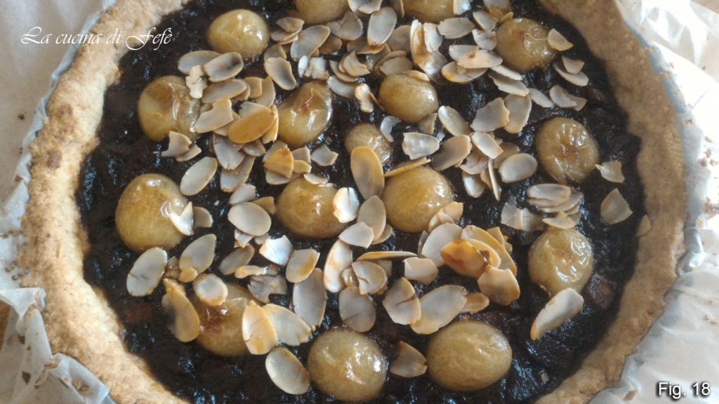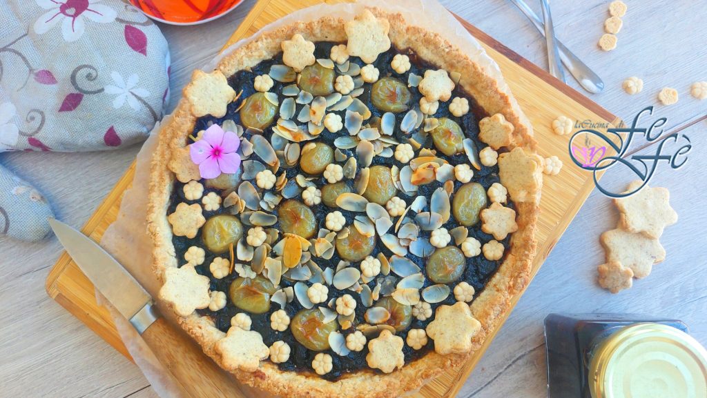 Hace unos días, pensé que finalmente ha llegado el momento de empezar a abrir unos tarros de mermelada preparados el año pasado y usar mis reservas de invierno. Por eso, decidí empezar haciéndolo con una tarta sin gluten que pudiera sorprender y deleitar a una amiga mía que lamentablemente es intolerante. En realidad, los eventos luego me impidieron disfrutar como hubiera querido de esta tarta en su compañía. Ya me imaginaba charlando frente a una humeante y aromática taza de infusión, como es tradición, y en cambio terminé comiéndola en el desayuno con el capuchino. Debo decir que hacía tiempo que lo deseaba y por eso fue un mimo realmente agradable. La masa quebrada de esta tarta está hecha con una mezcla de harinas sin gluten y una nota aromática proporcionada por las avellanas tostadas que se trituran junto con el azúcar y luego se añaden a la mezcla. Para el relleno, utilicé mi mermelada de manzana y azúcar muscovado, con un ligero toque de jengibre. Para quien no lo sepa, el azúcar muscovado es un tipo de azúcar de caña de color oscuro, no refinado, al que se le añade un porcentaje de melaza, lo que le otorga ese sabor característico. Obviamente es difícil que encuentren esta mermelada en el mercado, ya que fue un experimento mío, diría que exitoso. Pueden utilizar la que más les guste, estará bien de todos modos. Luego decoré con almendras laminadas y algunas uvas blancas para crear un contraste cromático y gustativo, que literalmente nos conquistó.