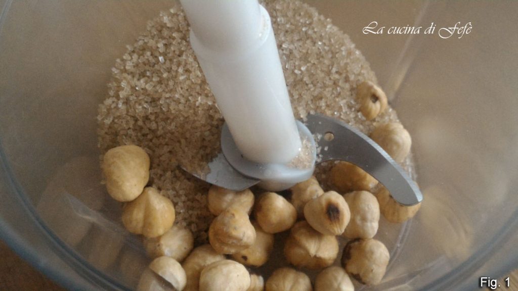 Empieza transfiriendo las avellanas ya tostadas a una batidora junto con el azúcar moreno (fig. 1).
