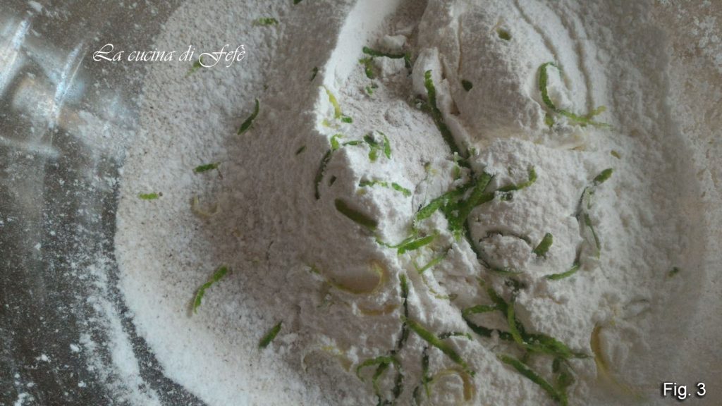 En un tazón mezcla las harinas previamente tamizadas con la cáscara de lima (fig. 3).