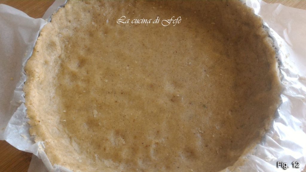 Retira la hoja superior y transfiere el disco al molde directamente con el papel para horno debajo. Haz que los bordes se adhieran con mucha delicadeza (fig. 12).