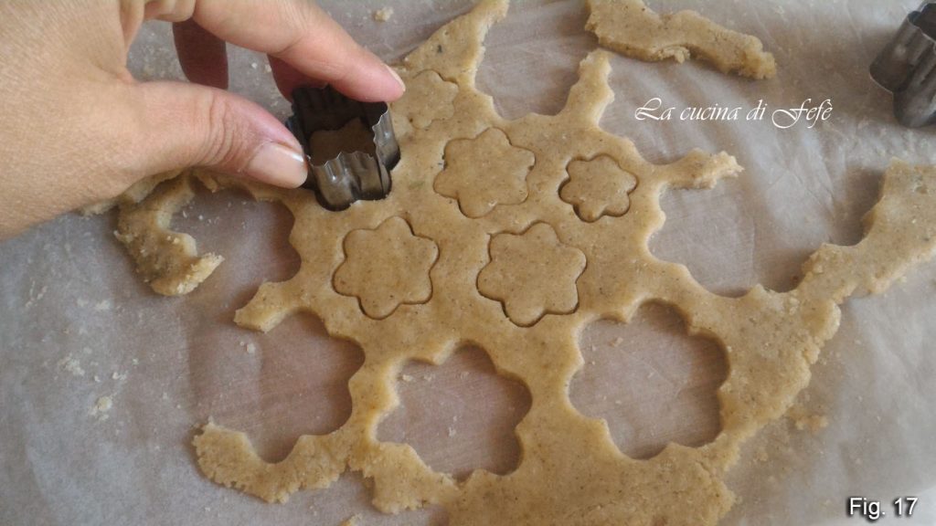Mientras tanto, vuelve a tomar el panecillo restante, extiéndelo de la misma manera y, con la ayuda de molde para galletas, obtén tus formas que servirán para decorar posteriormente la tarta*** (fig. 17).