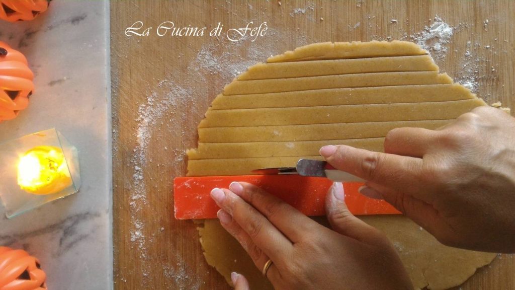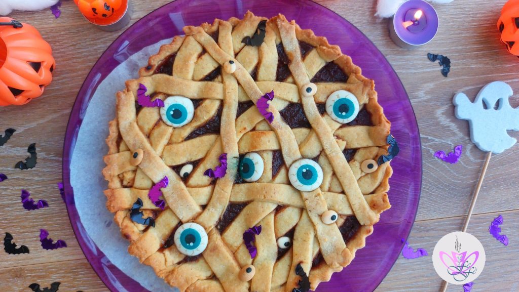 Si para la fiesta de Halloween estás buscando ideas creativas, monstruosamente deliciosas pero siempre en línea con tu idea de saludable y genuino, ¡estás en el lugar correcto! También este año no he querido echarme atrás en la preparación de dulces temáticos, porque aunque esta fiesta importada de la lejana América no me gusta particularmente, sin embargo, adoro decorar cada una de mis preparaciones y montar mis sets con props fotográficos, es decir, material escénico típico como calabacitas y velas. Reveladas estas mis reales motivaciones, esta tarta es monstruosamente buena y crujiente, con una masa quebrada al aceite, que la hace más ligera y digerible además de perfecta para quienes sufren de la intolerancia a la lactosa, porque es libre de mantequilla y leche. Además, es muy rápida de preparar, de hecho no requiere ningún reposo en la nevera, así que, una vez hecho el amasijo, podrás extenderlo de inmediato. El resto es pan comido: podrás dar rienda suelta a tu creatividad cortando la masa quebrada sobrante en tiras y disponiéndolas desordenadamente para simular las vendas de una momia, y decorarla con lo que más te sugiera la fantasía para un efecto escénico de estilo horror. La elección de la mermelada naturalmente debe evocar la sangre, pero si no eres amante de las conservas de fruta, ¡siempre puedes optar por una crema para untar cualquiera! Más allá de Halloween, será ideal también para tus desayunos saludables o meriendas genuinas.